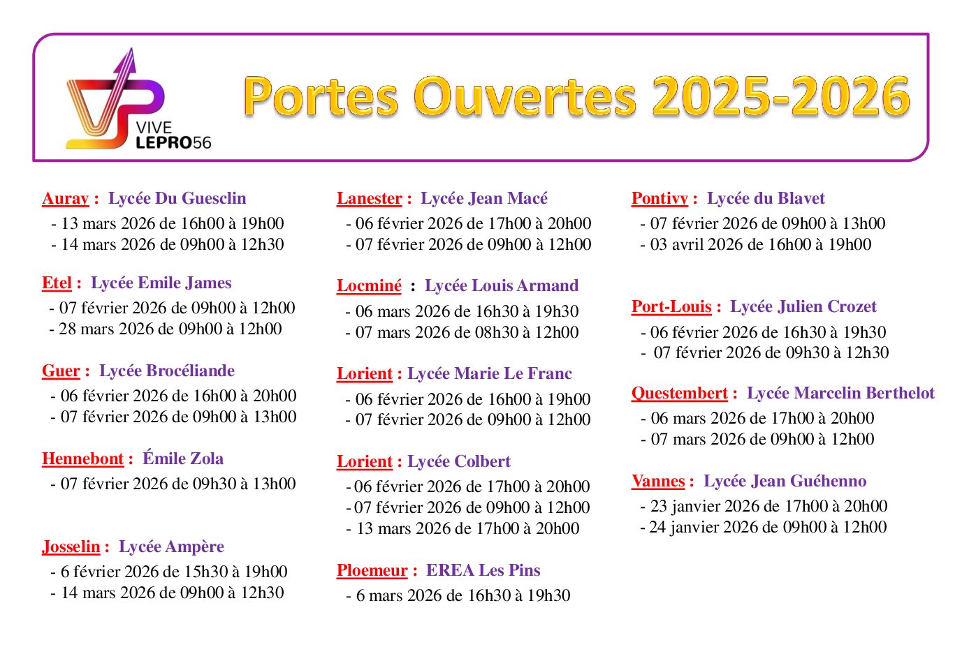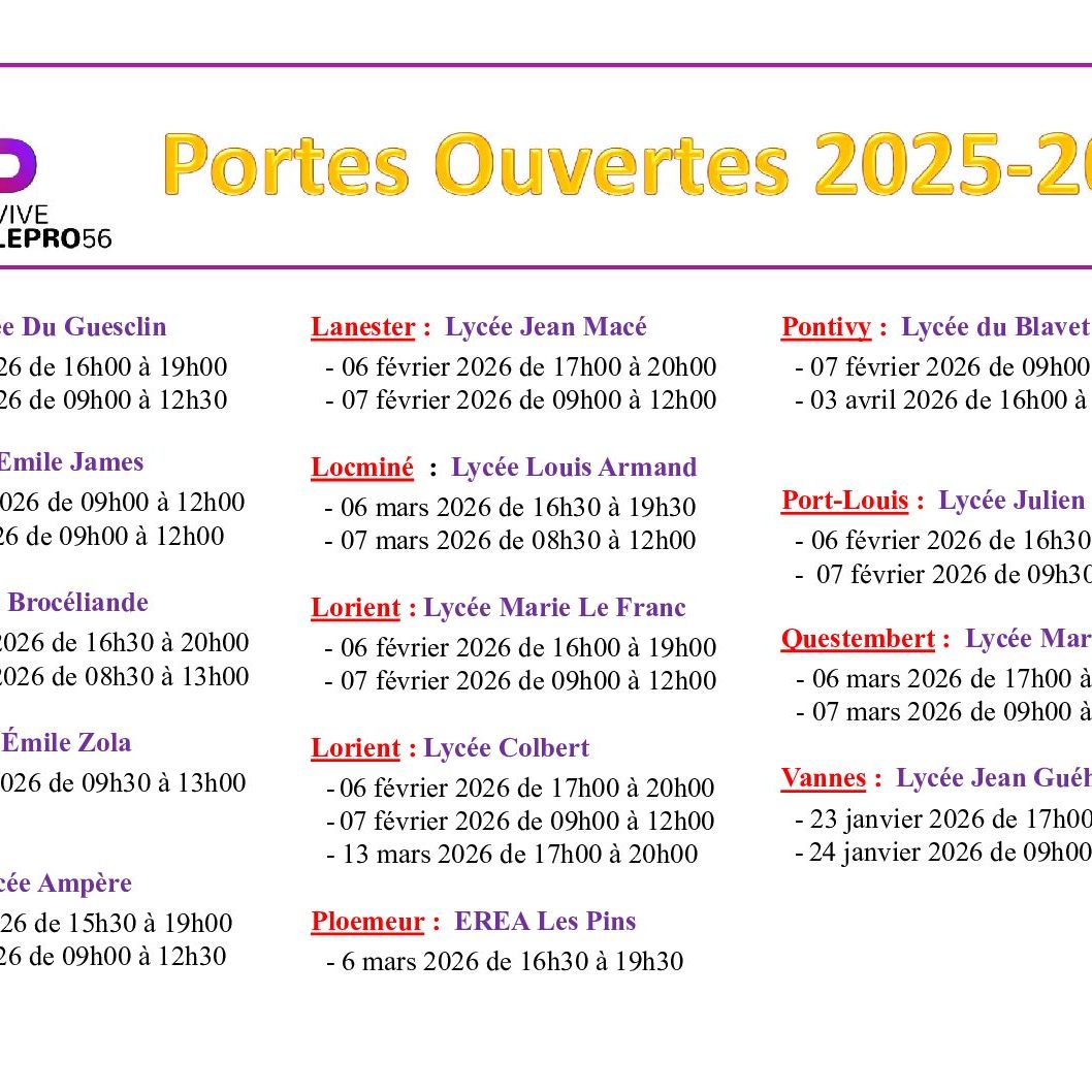 Retrouvez l’ensemble des Portes Ouvertes des formations professionnelles du Morbihan. Au plaisir de vous rencontrer lors de ces moments riches d’échanges, et qui permettent aux collégiens de conforter leur choix d’orientation. A bientôt, Vivelepro56 09/10/2024Post navigationPreviousPrevious post:Forum des Lycées – LorientA lire égalementForum des Lycées – Lorient09/10/2024Nouvelle voie Pro 3e17/06/2024Forum LOUDEAC/PONTIVY04/03/2022